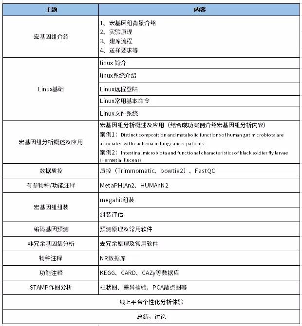 本課程從IF = 10及4分的SCI文章入手,從宏基因組背景介紹、實(shí)驗(yàn)(實(shí)驗(yàn)測(cè)序原理、建庫方法和流程、送樣注意事項(xiàng)等)、分析(下機(jī)數(shù)據(jù)質(zhì)控、有參注釋、無參組裝/預(yù)測(cè)/物種注釋/功能注釋等)、可視化作圖,讓您全面了解宏基因組分析每個(gè)過程,并結(jié)合案例文章,讓您了解宏基因組文章思路,助力科學(xué)研究。