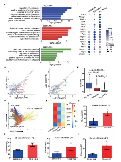 a HSC/MPP三個(gè)亞群的GO富集分析。b三種HSC/MPP亞型中富集的DEG的散點(diǎn)圖。c HSC/MPP1與HSC/MPP2(左)與 HSC/MPP3(右)中所有基因表達(dá)的散點(diǎn)圖。d箱線圖顯示了三種 HSC/MPP 亞型的 hscScore 分布。e軌跡分析重建HSC/MPP 到淋巴和骨髓祖細(xì)胞的譜系分化。f熱圖顯示了三種 HSC/MPP 亞型中HSC/MPP 特征基因和Cd93的表達(dá)模式。g使用 CD93 + SLAM-LSK (CD93 + HSC) 和 CD93 – HSC進(jìn)行初次移植后 8 周受者外周血 (PB) 中供體來(lái)源的嵌合體比例。h使用 CD93 + HSC 和 CD93 – HSC進(jìn)行初次移植后 20 周時(shí)受者 PB 中供體來(lái)源的嵌合體比例。i在使用 CD93 + HSC 和 CD93 – HSC進(jìn)行二次移植后 8 周時(shí)受者 PB 中的供體來(lái)源嵌合體比例。j使用 CD93 + HSC 和 CD93 – HSC進(jìn)行二次移植后 16 周時(shí)受者 PB 中供體來(lái)源的嵌合體比例。