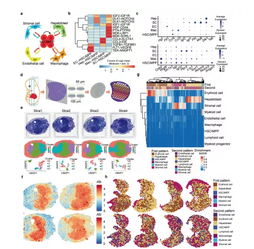 a示意圖展示 HSC/MPP 和生態(tài)位細(xì)胞(內(nèi)皮細(xì)胞、基質(zhì)細(xì)胞、成肝細(xì)胞和巨噬細(xì)胞)之間的細(xì)胞相互作用。b CellPhoneDB 分析展示主要的 HSC/MPP-生態(tài)位細(xì)胞相互作用對(duì)。c主要的HSC/MPP-生態(tài)位細(xì)胞相互作用對(duì)的配體(頂部)和相應(yīng)受體(底部)表達(dá)模式的散點(diǎn)圖。d 10×Visium ST 實(shí)驗(yàn)流程示意圖。e E14.5 胚胎組織切片的蘇木精和伊紅 (HE) 染色。f組織切片中成肝細(xì)胞標(biāo)記物Afp 的表達(dá)模式。g熱圖展示了FL斑點(diǎn)的富集分?jǐn)?shù)。h FL部分空間特征圖。