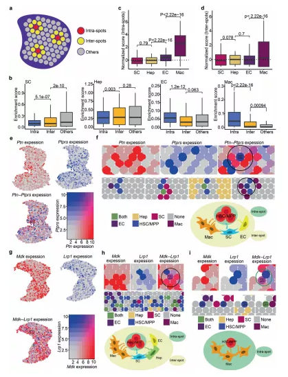 a點(diǎn)內(nèi)、點(diǎn)間及其他的示意圖。點(diǎn)內(nèi):HSC/MPP 定位點(diǎn);點(diǎn)間:HSC/MPP 包圍點(diǎn);其他,其他遠(yuǎn)端的點(diǎn)。b箱線圖展示點(diǎn)內(nèi)、點(diǎn)間和其他點(diǎn)中生態(tài)位細(xì)胞的富集分?jǐn)?shù)。c箱線圖展示了點(diǎn)內(nèi)生態(tài)位細(xì)胞的歸一化(富集)評(píng)分。d箱線圖顯示點(diǎn)間生態(tài)位細(xì)胞的歸一化(富集)評(píng)分。e FL中Ptn和Ptprs 的共表達(dá)模式。f 空間特征圖展示Ptn-Ptprs豐富的 HSC/MPP 擴(kuò)增單元。基因Ptn在生態(tài)位細(xì)胞定位點(diǎn)(頂部,紅色點(diǎn))和基因Ptprs在HSC/MPP 定位點(diǎn)(頂部,藍(lán)色點(diǎn))的表達(dá)模式。g FL中Mdk和Lrp1 的共表達(dá)模式。h富含Mdk -Lrp1 的HSC/MPP 擴(kuò)增單元(點(diǎn)間)的空間特征圖。i空間特征圖展示富含Mdk- Lrp1 的HSC/MPP 擴(kuò)增單元(點(diǎn)內(nèi))。