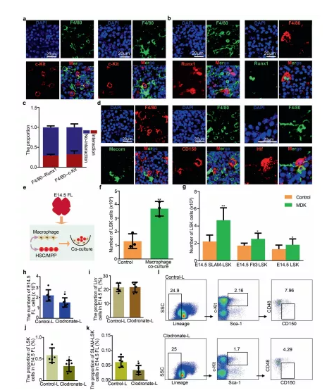 a免疫熒光分析顯示 E14.5 FL 冷凍切片中 F4/80(代表巨噬細(xì)胞)和 c-Kit(代表 HSCs/MPPs)的表達(dá)。b免疫熒光分析顯示 E14.5 FL 冷凍切片中 F4/80(代表巨噬細(xì)胞)和 Runx1(代表 HSCs/MPPs)的表達(dá)。C柱狀圖展示有和無(wú)細(xì)胞相互作用的 HSCs/MPPs 的比例。d免疫熒光分析顯示 E14.5 FL 冷凍切片中 F4/80(代表巨噬細(xì)胞)、CD150(代表 HSCs/MPPs)、Mecom(代表 HSCs/MPPs)和 Hlf(代表 HSCs/MPPs)的表達(dá)。f源自巨噬細(xì)胞和 HSC/MPP 共培養(yǎng)系統(tǒng)的 HSCs/MPPs(LSK 細(xì)胞)的數(shù)量。g源自MDK補(bǔ)充培養(yǎng)物的 100 個(gè) HSCs/MPPs(LSK、Flt3 -LSK 和 SLAM-LSK 細(xì)胞)的HSCs/MPPs(LSK 細(xì)胞)的數(shù)量。h氯膦酸鹽-脂質(zhì)體和對(duì)照-脂質(zhì)體處理后 E14.5 FL 中的總細(xì)胞數(shù)。i氯膦酸鹽處理前后 E14.5 FL中譜系- (Lin- ) 細(xì)胞的比例。j氯膦酸鹽處理前后 E14.5 FL 中 LSK 細(xì)胞的比例。k氯膦酸鹽處理前后 E14.5 FL 中 SLAM-LSK 細(xì)胞的比例。l流式細(xì)胞儀分析顯示E14.5 FL在氯膦酸鹽處理前后Lin -,LSK,SLAM-LSK的細(xì)胞比例。