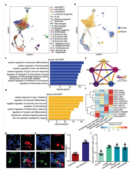 a E14.5 FL中所有細(xì)胞類型的UMAP 可視化。b來(lái)自小鼠(E14.5)和人類(受孕后 11 周)的 FL 細(xì)胞群的 UMAP 可視化。c對(duì)人類 HSCs/MPPs中top DEG 進(jìn)行 GO 生物過(guò)程相關(guān)的通路富集分析。d對(duì)小鼠 HSCs/MPPs 中top DEG進(jìn)行GO生物過(guò)程相關(guān)的通路富集分析。e配體-受體相互作用網(wǎng)絡(luò)展示了人 HSC/MPP與生態(tài)位細(xì)胞之間的潛在通訊網(wǎng)絡(luò)。f熱圖展示主要的人 HSCs/MPPs-生態(tài)位細(xì)胞相互作用對(duì)。g – h免疫熒光分析展示CD68(代表巨噬細(xì)胞)和 CD34(代表 HSCs/MPPs)在人受孕后第 11 周 FL 切片中的表達(dá)。i柱狀圖展示有和無(wú)細(xì)胞相互作用的 HSCs/MPPs 所占的比例。j源自小鼠巨噬細(xì)胞和 HSCs/MPPs 共培養(yǎng)系統(tǒng)的人 CD34 + HSCs/MPPs的數(shù)量。