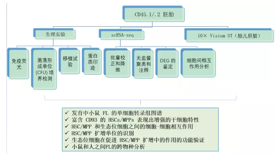 將雄性CD45.1小鼠與雌性CD45.2小鼠雜交獲得小鼠胚胎;終止妊娠后獲得的人類胚胎;健康志愿者處收集人類臍帶血 (CB) 樣本