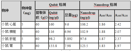 表1:Qubit和Nanodrop檢測濃度及吸光度