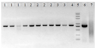 圖3:提取小鼠微量(~5 mg)精子,將提取的DNA進行PCR擴增,擴增產(chǎn)物進行跑膠,瓊脂糖濃度為1%,70 V電壓,跑膠45 min。1:小鼠1精子;2:小鼠2精子;3:小鼠3精子4:小鼠4精子;5:DL2000 Marker;6:陽性對照DNA(825bp);7:陰性對照。