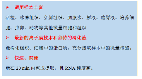 本產(chǎn)品采用了離子膜技術(shù)和獨特的消化液,能消化組織、細胞中的蛋白質(zhì),這種反復(fù)優(yōu)化了裂解液和洗脫液配方,可使樣本中的微量核酸能夠被充分地提取出來。