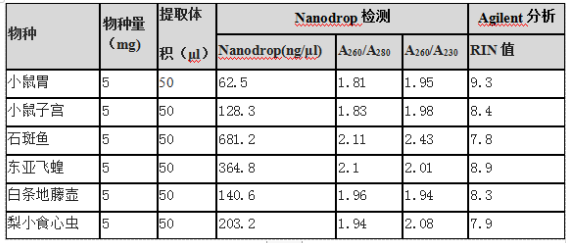 用百邁客試劑盒,提取5 mg的不同動物組織中的RNA,然后檢測RNA的濃度以及完整性。結(jié)果如下: