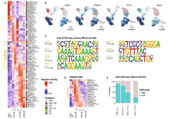 作為獨(dú)立驗(yàn)證,首先從pro-B細(xì)胞中檢索了大量ATAC-seq數(shù)據(jù),顯著富集的TF motif證實(shí)了與pro-B G1期細(xì)胞相關(guān)的9個(gè)TF(EBF1、FOXO1、TCF3、RFX5、IRF1、TCF4、LEF1、ERG、FLI1)(圖 2c)。pro-B活性TF在兒童BM數(shù)據(jù)集中也具有高度相似的活性譜(圖 2d)。接下來,分析了包括TF與目標(biāo)基因表達(dá)相關(guān)性,以及每個(gè)目標(biāo)基因位點(diǎn)的TF motif。根據(jù)發(fā)現(xiàn)集中找到的TF,在訓(xùn)練/測試集中預(yù)測它們的靶基因。為了測試預(yù)測的靶基因是否受TF調(diào)控,本研究檢索了PAX5、EBF1和BCL11A的ChIP-seq數(shù)據(jù),這些數(shù)據(jù)在人類細(xì)胞系模型 Nalm-6中可用,使用GREA T獲得與基因關(guān)聯(lián)的peak。對于PAX5和EBF1,超過75%的預(yù)測目標(biāo)具有ChIP-seq peak關(guān)聯(lián)(圖 2e)。ATAC-seq motif富集與基于ChIP-seq的TF靶基因位點(diǎn)驗(yàn)證,結(jié)果高度一致,證明TF活性評(píng)分反映了調(diào)節(jié)作用。說明本研究對健康人BM單細(xì)胞轉(zhuǎn)錄組的分析為基因表達(dá)和TF活性變化提供了全面的參考,這些變化表征了單細(xì)胞分辨率下早期B細(xì)胞譜系分化的特征。