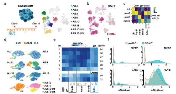 為了表征ALL(E/R)中常見的TF融合的白血病細(xì)胞,本研究對6個(gè)兒童E/R+ pre-B-ALL病例進(jìn)行了scRNA-seq,收集6個(gè)診斷期和2個(gè)誘導(dǎo)化療第15天的BM樣本(圖 3a)。基于DNTT表達(dá)及其與正常BM細(xì)胞類型的明確分離,確定了每個(gè)供體中的白血病細(xì)胞簇(圖 3b)?;贐細(xì)胞譜系簇特異性基因集,發(fā)現(xiàn)診斷時(shí)白血病母細(xì)胞類似于pro-B分化狀態(tài)(圖 3c)。該分析同樣將pro-B細(xì)胞鑒定為*接近的正常分化狀態(tài),這與之前的研究一致。細(xì)胞周期狀態(tài)在不同情況下不同,ALL3中的循環(huán)細(xì)胞比例*低,ALL9中的*高比例(圖 3d)。對于具有中期誘導(dǎo)治療的2個(gè)病例(ALL10 和 ALL12),在第15天收集的樣本中細(xì)胞分離為不同的細(xì)胞狀態(tài)(圖 3a、d),表明治療進(jìn)一步改變了白血病細(xì)胞狀態(tài)。