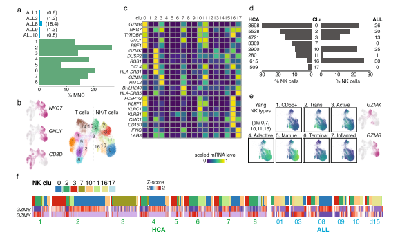 為了進(jìn)一步表征免疫細(xì)胞群,將HCA和E/R+ ALL供體的T細(xì)胞和NK細(xì)胞匯集在一起進(jìn)行聯(lián)合分析?;诰垲惡蚼arker基因分析,可以區(qū)分幾種不同的NK細(xì)胞類型(圖 4b、c)。篩選表達(dá)GNLY或NKG7的cluster(cluster 0、2、3、7、10、11、16),發(fā)現(xiàn)與來自HCA供體的NK細(xì)胞相比,來自ALL BM的NK細(xì)胞被隨機(jī)分配給這些cluster(圖 4d)。具體來說,所有NK細(xì)胞主要代表cluster 10和16,它們與表達(dá)未成熟CD56bright 和過渡NK細(xì)胞的顆粒酶 K(GZMK)相匹配(圖 4e 中的基因組評(píng)分代表來自scRNA-seq研究的NK亞型)。相比之下,大多數(shù)正常 BM NK細(xì)胞代表表達(dá)顆粒酶 B(GZMB)和穿孔素(PRF1)的成熟或終末NK細(xì)胞(cluster 0)。因此,E/R+白血病細(xì)胞可能會(huì)主動(dòng)逃避NK細(xì)胞的細(xì)胞毒性,然而,NK類型的頻率因供體而異(圖 4f)。高表達(dá)IFNG的cluster 7幾乎完全對應(yīng)于HCA供體 3,而與其他ALL病例相比,細(xì)胞周期高度活躍的ALL8和ALL9更類似于正常BM中的成熟或活性NK細(xì)胞譜??傊?,白血病細(xì)胞狀態(tài)與正常pro-B分化狀態(tài)的不同之處在于干/祖細(xì)胞特異性基因和幾種免疫調(diào)節(jié)基因的高表達(dá)。免疫調(diào)節(jié)基因的變化反映為E/R+ BM內(nèi)更多不成熟的NK細(xì)胞類型。