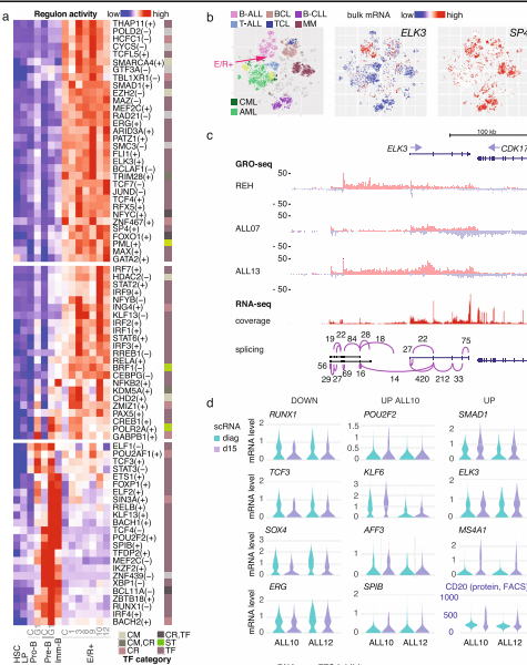 基于bulk RNA分析可以驗(yàn)證它們在B-ALL中的表達(dá),在E/R+亞型(紅色箭頭)中檢測到的比例*高,如在t-SNE圖上比較血液系統(tǒng)惡性腫瘤所示(圖 5b),其中惡性淋巴瘤在圖上突出顯示。兩種常見的B-ALL亞型(E/R+和高超二倍體病例)顯示出類似的高ELK3,而升高的SP4則更具 E/R 特異性,進(jìn)一步分析了E/R+細(xì)胞中的這些TF基因座(圖 5c)。本研究使用GRO-seq對E/R+ BM中的新生轉(zhuǎn)錄進(jìn)行了分析,揭示了Pol2參與編碼和非編碼區(qū)的主動(dòng)起始和延伸。GRO-seq 證實(shí)了這些基因位點(diǎn)在 E/R+細(xì)胞中的轉(zhuǎn)錄活性(圖 5c)。此外,還揭示了ELK3上游未注釋(Refseq、UCSC 或 Gencode)的轉(zhuǎn)錄起始位點(diǎn)(TSS)(圖 5c)。兩個(gè)lncRNA庫在該基因組區(qū)域內(nèi)具有匹配的轉(zhuǎn)錄本,但注釋之間的一致性很差。因此,在E/R+ BM(n = 8,scRNA-seq 和 GRO-seq 分析中的匹配樣本)中使用配對的bulk RNA-seq 進(jìn)一步檢測了該基因座內(nèi)的剪接模式。帶注釋的ELK3轉(zhuǎn)錄本具有來自剪接點(diǎn)跨越reads的支持,而上游轉(zhuǎn)錄本與lncRNA結(jié)構(gòu)*匹配(圖 5c)。