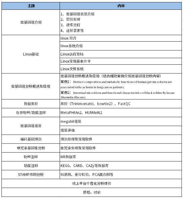 本課程從IF=10及4分的SCI文章入手,從宏基因組背景介紹、實驗(實驗測序原理、建庫方法和流程、送樣注意事項等)、分析(下機數(shù)據(jù)質(zhì)控、有參注釋、無參組裝/預(yù)測/物種注釋/功能注釋等)、可視化作圖,讓您全面了解宏基因組分析每個過程,并結(jié)合案例文章,讓您了解宏基因組文章思路,助力科學(xué)研究。