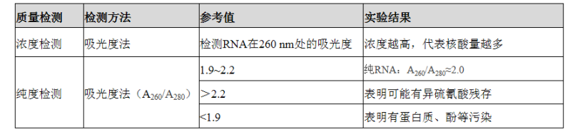 由于RNA具有共軛結(jié)構(gòu),可以吸收紫外光,故測定RNA溶液在260 nm的吸光度值,可計(jì)算出RNA的含量。其中純度高的RNA,A260/A280比值應(yīng)在1.9~2.2之間,若比值>2.2,表明可能有異硫氰酸,若比值<1.9,表明有蛋白質(zhì)、酚等污染;建議重新提取RNA。