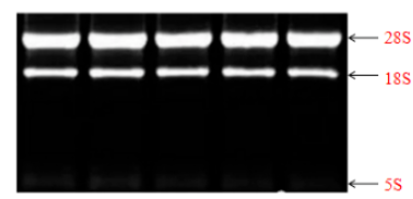 真核生物RNA特有28S、18S、5S三條帶,進(jìn)行瓊脂糖凝膠電泳分析時,28S條帶的亮度大概是18S條帶的兩倍或者以上,且無拖尾,說明RNA的完整性高、未被其他雜質(zhì)污染。若出現(xiàn)其他條帶、或者條帶彌散拖尾,建議重新提取RNA。