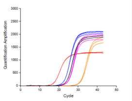 圖7:以1?μg不同物種的RNA為模板(紅色:人肝癌細(xì)胞;藍(lán)色:雞;黑色:斑馬魚;紫色:水稻種子;黃色:番茄果),用BiomarkerScript Ⅱ 1st Strand cDNA Synthesis Kit進(jìn)行逆轉(zhuǎn)錄,得到cDNA產(chǎn)物。再以100 ng不同物種的?cDNA為模板,用Biomarker?2×SYBR Green Fast qPCR Mix進(jìn)行qPCR擴(kuò)增。
