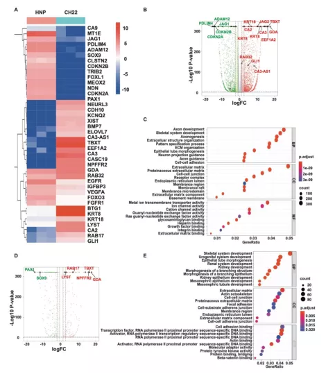 與HNP相比,在CH22中確定了313個增加的DAR 和 1,749 個減少的DAR。DAR的motif分析顯示CTCF、Nkx2-2、Tcfe2a_2、MED-1 和 E2A motif在CH22中高度富集。還確定了DAR中的DEG,如GDA、TBXT和PAX1(圖 1D)。GO分析顯示DAR中的基因與骨骼系統(tǒng)發(fā)育有關(圖 1E);KEGG富集分析顯示這些基因富集在PI3K-AKT信號通路上。