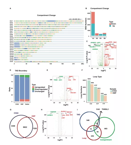 在腫瘤發(fā)生過程中,染色質(zhì)compartments會進行轉換。與HNP相比,CH22的每條染色體中都發(fā)現(xiàn)了compartments轉換,尤其是在chr1、9、13-16和22(圖3A)。HNP中9.99%的compartments A在CH22中為compartments B,6.06%的compartments B在CH22中為compartments A,從A到B的轉換中基因的表達顯著下調(diào)(p=1.08 e-74 ),反之亦然(p=4.11 e- 47 )。