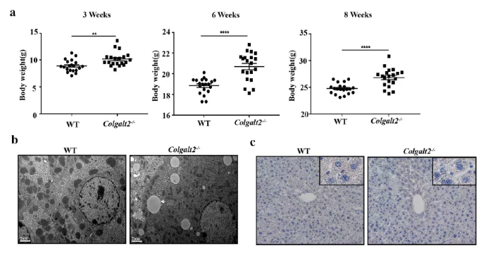 通過肝組織的PCR和western blotting,結(jié)果顯示Colgalt2?/?小鼠中不表達COLGALT2。在3,6,8周齡時分別對Colgalt2?/?和WT小鼠稱重,結(jié)果顯示Colgalt2敲除增加了小鼠的體重(圖1a)。通過透射電鏡觀察發(fā)現(xiàn),6周齡Colgalt2?/?小鼠肝細胞中有脂滴聚集(圖1b)。然而,在6-8 周齡時,WT小鼠和Colgalt2?/?小鼠的肝油紅O染色和TG含量沒有明顯差異(圖1c)。