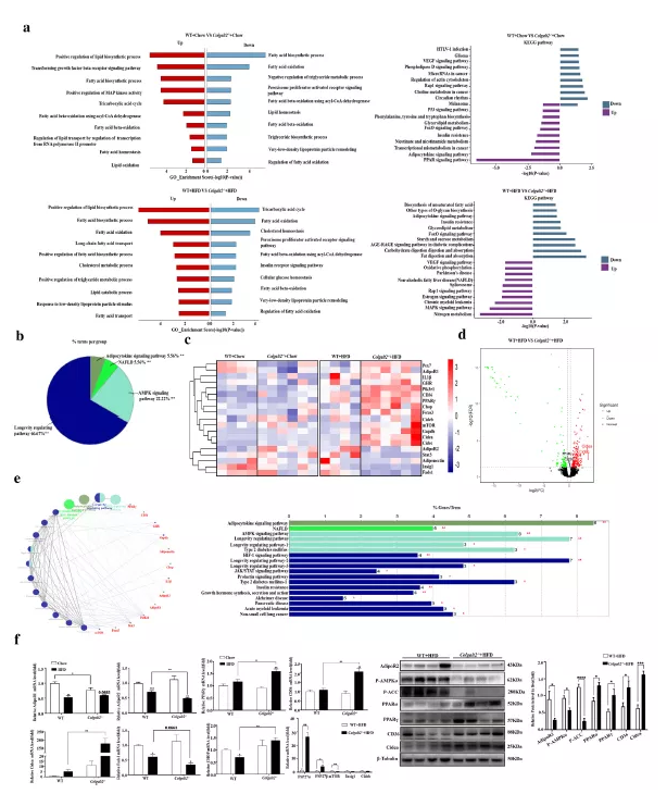 為了探索NAFLD中Colgalt2缺乏的潛在機制,作者對WT小鼠和飼喂HFD或標準飼料的Colgalt2?/?小鼠肝組織進行ONT全長轉(zhuǎn)錄組測序。結(jié)果顯示,與WT小鼠相比,HFD喂養(yǎng)的Colgalt2?/?小鼠中有321個DEGs。為了明確DEGs的功能,分別對上調(diào)和下調(diào)的 DEGs進行KEGG通路富集分析(P < 0.05) (圖5a)。對于上調(diào)的基因,KEGG分析顯示這些差異表達基因顯著富集于MAPK信號通路、NAFLD、和氧化磷酸化。下調(diào)的基因富集于脂肪消化和吸收、甘油脂代謝。在這些途徑中,19個差異表達基因與脂代謝密切相關(guān),包括adipoR1、adipoR2和脂質(zhì)合成相關(guān)的分子,包括Cidea和Cidec (FSP27)、Cd36和PPARγ(圖5c)。為了進一步研究這19個基因在這些通路中的作用,使用ClueGO和CluePedia工具解讀這些通路網(wǎng)絡(luò)(圖5 d)。這些基因在AMPK信號通路、脂肪細胞因子信號通路和NAFLD等中富集(圖5 b和e)。