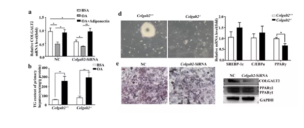 為了探究COLGALT2缺乏在脂肪萎縮中的作用, 在3T3-L1細胞中誘導(dǎo)了前脂肪細胞分化,從Colgalt2?/?和WT小鼠的eWAT中分離原代前脂肪細胞(圖6d)。油紅 O染色結(jié)果顯示干擾Colgalt2降低了前脂肪細胞分化為脂肪細胞(圖6e)。此外,干擾Colgalt2下調(diào)了脂肪前細胞向脂肪細胞分化過程中PPARγ的表達(圖6e)。此外,從Colgalt2?/?和WT小鼠的eWAT中分離出原代前脂肪細胞,結(jié)果顯示,Colgalt2敲除降低了PPARγ mRNA水平(圖6d)。然而,來自Colgalt2?/?和WT小鼠的原代前脂肪細胞分化后,C/EBPα、C/EBPβ或SREBP-1c mRNA水平無顯著差異。