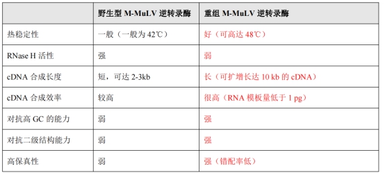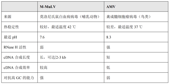 表1:野生型M-MuLV和野生型AMV兩種逆轉(zhuǎn)錄酶性能對(duì)比