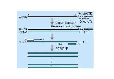 逆轉(zhuǎn)錄(Reverse Transcription)是以RNA為模板,在逆轉(zhuǎn)錄酶的催化作用下,合成RNA/DNA雜合雙鏈,然后水解雜合雙鏈中的RNA,得到互補(bǔ)的單鏈cDNA的過(guò)程。得到的cDNA單鏈可以作為擴(kuò)增模板,合成雙鏈DNA。cDNA的合成可以用與后續(xù)的PCR實(shí)驗(yàn)、qpcr實(shí)驗(yàn)、基因檢測(cè)、基因工程等各個(gè)領(lǐng)域。