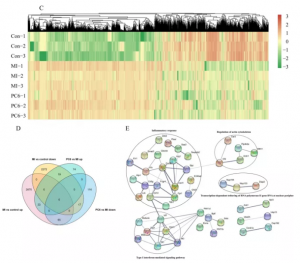 為了探討針刺治療心肌梗死的機(jī)制,作者利用納米孔完成了不同組的基因表達(dá)檢測。RNA-seq結(jié)果顯示,與對照組相比,MI組有5083個(gè)差異表達(dá)基因,PC6組與MI組相比有324個(gè)差異表達(dá)基因。通過聚類分析將對照組、MI組和PC6組中上調(diào)和下調(diào)基因制作熱圖和維恩圖,發(fā)現(xiàn)MI組2773個(gè)差異基因上調(diào),針刺治療下調(diào)了其中的65個(gè)差異基因,同時(shí),在MI組的2308個(gè)下調(diào)的差異基因中,針刺治療可逆轉(zhuǎn)19個(gè)差異基因的表達(dá)。作者推測這84個(gè)差異基因可能是針刺抗心肌缺血作用的關(guān)鍵靶點(diǎn)。基于STRING數(shù)據(jù)庫對MI和PC6共同調(diào)控的差異基因進(jìn)行蛋白-蛋白相互作用(PPI)網(wǎng)絡(luò)分析。結(jié)果表明,蛋白質(zhì)主要富集了4類,主要包括:炎癥反應(yīng),肌動蛋白細(xì)胞骨架的調(diào)節(jié),I型干擾素介導(dǎo)的信號通路,以及RNA聚合酶II基因DNA在核外周的轉(zhuǎn)錄依賴鏈。