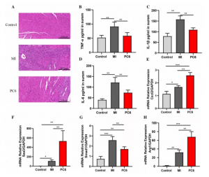 差異基因主要富集在炎癥反應(yīng)信號通路中,通過HE染色顯示MI組炎性細(xì)胞大量積聚,針刺可明顯減少炎性細(xì)胞浸潤。檢測血清中炎性細(xì)胞因子的水平顯示MI組血清TNF-α(腫瘤壞死因子-α)、IL-1β(白細(xì)胞介素-1β)、IL-6(白細(xì)胞介素-6)水平較對照組升高,針刺可降低這些炎性細(xì)胞因子水平,并通過PCR進(jìn)行了驗(yàn)證。
