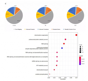 差異AS分析結(jié)果顯示,本研究共鑒定出347個(gè)差異AS事件,其中上調(diào)174個(gè),下調(diào)173個(gè)。AS上調(diào)事件數(shù)量與AS下調(diào)事件數(shù)量相同。與對照組相比,MI組有129例AS事件差異上調(diào),147例AS事件差異下調(diào)。與MI組相比,PC6組有45個(gè)AS事件差異上調(diào),26個(gè)AS事件差異下調(diào)。通過GO和KEGG富集分析,作者發(fā)現(xiàn)這些基因富集的前10個(gè)通路包括核糖體、HIF-1信號通路、肥厚型心肌病、擴(kuò)張型心肌病。結(jié)果表明,這些參與差異AS事件的基因與心臟病有關(guān)。
