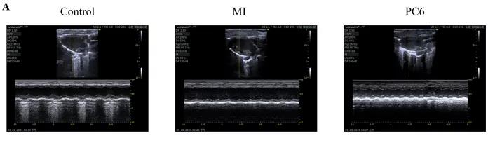 成年雄性C57BL/6雄性小鼠隨機(jī)分為對照組、MI組和PC6組。MI組小鼠為通過結(jié)扎冠狀動脈左前降支(LAD)形成MI模型,PC6組在造模完成后,針刺內(nèi)關(guān)穴治療5天后取材。經(jīng)胸超聲心動圖評估MI手術(shù)前后小鼠心功能情況,并進(jìn)行血清心肌酶和炎癥細(xì)胞因子的測定,之后三組樣本各取3個(gè)重復(fù),共9個(gè)樣本進(jìn)行ONT全長轉(zhuǎn)錄組測序。