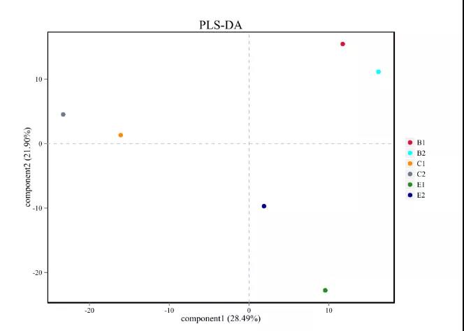 偏最小二乘判別分析(Partialleast squares discriminant analysis,PLS-DA)是多變量數(shù)據(jù)分析技術(shù)中的判別分析法,經(jīng)常用來處理分類和判別問題。通過對(duì)主成分適當(dāng)?shù)男D(zhuǎn),PLS-DA可以有效的對(duì)組間觀察值進(jìn)行區(qū)分,并且能夠找到導(dǎo)致組間區(qū)別的影響變量。PLS-DA采用了經(jīng)典的偏最小二乘回歸模型,其響應(yīng)變量是一組反應(yīng)統(tǒng)計(jì)單元間類別關(guān)系的分類信息,是一種有監(jiān)督的判別分析方法。因無監(jiān)督的分析方法(PCA)對(duì)所有樣本不加以區(qū)分,即每個(gè)樣本對(duì)模型有著同樣的貢獻(xiàn),因此,當(dāng)樣本的組間差異較大,而組內(nèi)差異較小時(shí),無監(jiān)督分析方法可以明顯區(qū)分組間差異;而當(dāng)樣本的組間差異不明晰,而組內(nèi)差異較大時(shí),無監(jiān)督分析方法難以發(fā)現(xiàn)和區(qū)分組間差異。另外,如果組間的差異較小,各組的樣本量相差較大,樣本量大的那組將會(huì)主導(dǎo)模型。有監(jiān)督的分析(PLS-DA)能夠很好的解決無監(jiān)督分析中遇到的這些問題。
