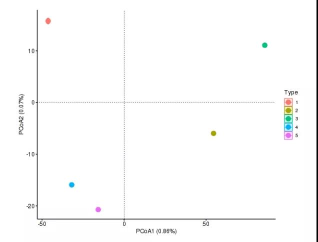 分型分析,主要通過統(tǒng)計(jì)聚類的方法研究不同樣本菌群物種/功能結(jié)構(gòu)的分型情況。分型分析過程中一般不考慮環(huán)境因子等外部因素的影響。通過分型分析,可以將菌群物種/功能結(jié)構(gòu)相似的不同樣本聚為一類,主要適用于特定環(huán)境樣本的菌群/功能分型,如腸道型(enterotypes)、口腔分型等。通常根據(jù)菌群在所選分類水平上的相對(duì)豐度,計(jì)算 Jensen-Shannon Distance和PAM (Partitioning Around Medoids)進(jìn)行聚類,通過 Calinski-Harabasz (CH)指數(shù)計(jì)算最佳聚類 K 值,然后采用 Between-class analysis (BCA)或principal coordinates analysis (PCoA)進(jìn)行可視化。