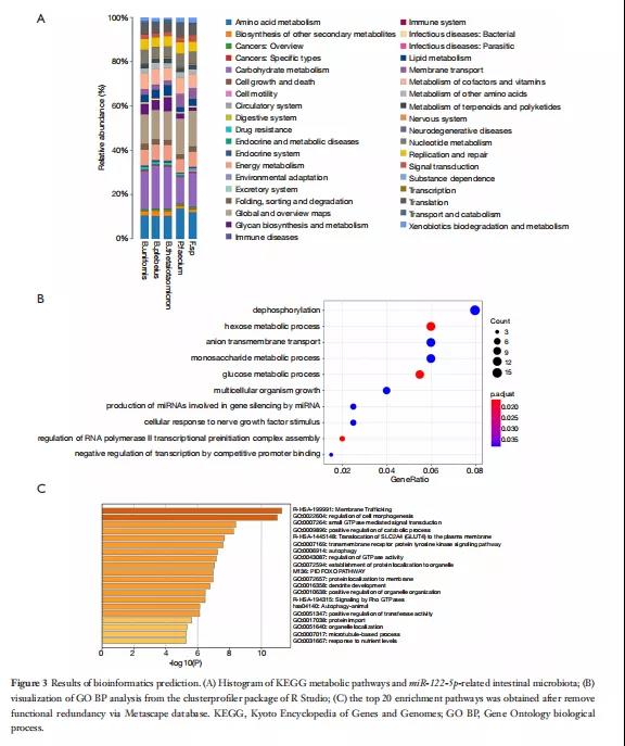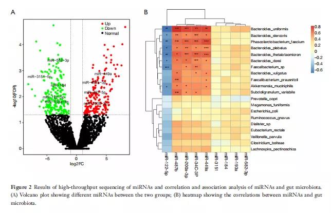 通過行Spearman相關分析。圖2B顯示了一個熱圖,描繪了五個與某些微生物區(qū)系具有統(tǒng)計顯著正相關和負相關的miRNA(P<0.05)。在這五種miRNA中,miR-122-5p在哺乳動物的進化過程中高度保守,與八種腸道細菌相關,包括兩種腸道細菌B.uniformis和P.faecium,它們有顯著差異(分別為P=0.023和0.031)。