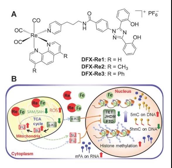 文章設計了三個線粒體靶向錸(I)配合物,其中加入了一種臨床鐵螯合劑脫鐵石(DFX),以同時干擾線粒體代謝和鐵穩(wěn)態(tài)。其中,DFX-Re3可以將細胞鐵遷移到線粒體,干擾線粒體代謝,包括與表觀遺傳修飾相關的關鍵代謝物。