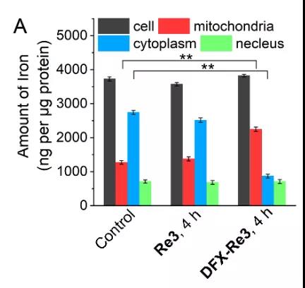 (1)ICP-MS實驗:DFX-Re3將細胞中鐵轉移到線粒體