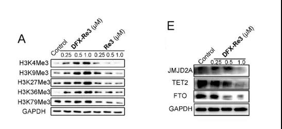 通過免疫印跡實驗發(fā)現(xiàn)DFX-Re3處理后抑制甲基化組蛋白H3、JMJD2A、TET2、FTO等甲基化修飾酶的表達。細胞質中鐵含量的降低,同時這些結果表明,鐵在細胞內轉移到線粒體可以增加DNA、RNA和組蛋白甲基化水平。