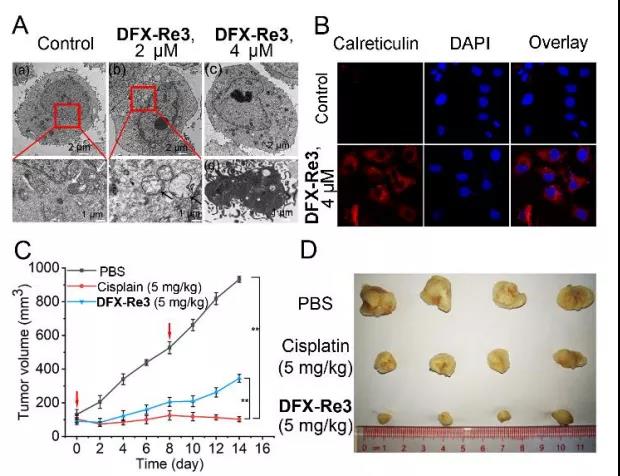 在體內和體外評估了DFX-Re3的抗癌機制。透射電鏡觀察顯示,DFX-Re3 (2 M, 24 h)處理后線粒體明顯膨脹,提示MMP缺失。濃度較高時,細胞核邊緣和中心出現(xiàn)染色質凝聚,細胞核碎裂,提示晚期凋亡。Annexin V/碘化丙啶(PI)雙染色顯示,在DFX-Re3處理的樣品中,凋亡早期和晚期細胞比例呈劑量依賴性增加(圖S36)。DFX-Re3激活caspase 3/7, Z-VAD-FMK(泛caspase抑制劑)預處理可抑制細胞死亡率。與之前的RNA-seq結果一致,DFX-Re3可以誘導多種免疫相關基因的表達改變,DFX-Re3誘導免疫相關基因表達改變。誘導鈣網(wǎng)蛋白調控,這是免疫原性死亡的重要分子標記。這些結果表明,DFX- Re3可誘導caspase依賴的免疫原性凋亡。體內抗腫瘤實驗中,DFX-Re3未見小鼠死亡或體重明顯減輕,治療結束時,DFX-Re3未見臟器明顯病理改變。這些數(shù)據(jù)表明,DFX-Re3在體內具有高的抗癌作用和低的全身毒性。