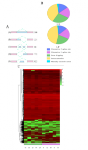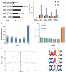 APA和AS的鑒定增強了我們對轉錄異構體多樣性生物學作用的理解。在本研究中,確定了9035例AS事件,并將其分為五類(圖2)。在檢測到的全部轉錄本中,有6.86%由某種可變剪切形式產生,其中內含子保留是最常見的可變剪切事件。此外,在88092個基因位點上進一步確定了207955個APA事件。