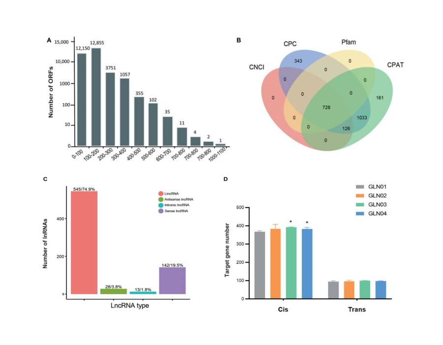 總共鑒定了38108個ORF,包括30323個(79.57%)完整的ORF,它們同時具有起始密碼子和終止密碼子。就完整的ORF而言,100-200 bp(12855個ORF)、0-100 bp(12150個)和200-300 bp(3751個)長度所占比例最大(圖3A)。共鑒定出728個lncRNAs,平均長度在298到4362 nt之間。這些lncRNAs進一步分類為545個基因間區(qū)lncRNAs(74.86%)、28個反義lncRNAs(3.85%)、13個內含子lncRNAs(1.79%)和142個正義lncRNAs(19.50%)(圖3C)。研究還發(fā)現(xiàn),這些lncRNAs調控的順式靶基因比那些反式靶基因多(圖3D)。發(fā)現(xiàn)在GLN01和GLN03之間(Student t檢驗,p=0.002),以及GLN01和GLN04之間(p=0.037),這些lncRNAs調控的順式靶基因顯著增加,而這些lncRNAs調控的反式靶基因在整個莖發(fā)育過程中未發(fā)現(xiàn)顯著變化。