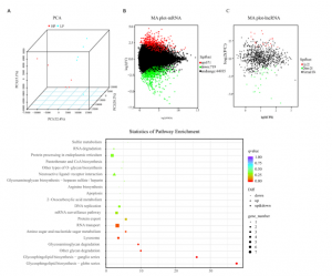 共鑒定出1390個mRNAs(671個上調,719個下調)和50個lncRNAs(22個上調,28個下調)(圖4B和C)。在本研究中,預測DE-lncRNAs與其靶mRNA協(xié)同發(fā)揮其功能,從而說明珊瑚對環(huán)境變化的適應。對lncRNA靶向mRNAs進行KEGG富集分析,以探索鹿角珊瑚lncRNAs的功能。根據(jù)KEGG分析,DE-lncRNA靶向mRNA在五條途徑中顯著富集(q值<0.05),如ko00603鞘糖脂生物合成-球狀系列、ko00531氨基糖降解、ko00604鞘糖脂生物合成-神經(jīng)節(jié)苷脂系列、ko00511其他聚糖降解、ko04142溶酶體、,ko00520氨基糖和核苷酸糖代謝,以及ko03013 RNA轉運。