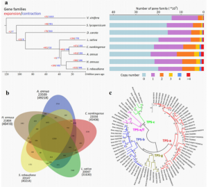 物種演化過程中,往往伴隨著基因家族的擴張與收縮,基因家族(gene family)是來源于同一個祖先,由一個基因通過基因重復而產(chǎn)生兩個或更多的拷貝而構(gòu)成的一組基因,它們在結(jié)構(gòu)和功能上具有明顯的相似性,編碼相似的蛋白質(zhì)產(chǎn)物。而特定基因家族的擴張可能在促進植物表型多樣化和新性狀進化中發(fā)揮重要作用。通過與具有相似/相反生物學功能的近緣物種比較,獲得相關(guān)基因家族,并將選擇其中某種擴張基因家族聯(lián)合轉(zhuǎn)錄組差異表達以及代謝組,可以深度挖掘目的物種重要性狀形成機制與重要代謝通路。該研究方法是中藥、花卉、蔬果等植物研究中的重要環(huán)節(jié)。