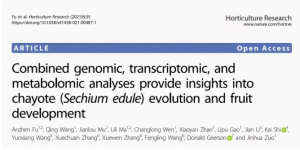 主要內(nèi)容:本研究通過Nanopore技術(shù)首次完成高質(zhì)量的佛手瓜基因組,基因組組裝大小為606.42Mb,ContigN50=8.4 Mb。并基于Hi-C技術(shù)將基因組序列掛載至14條染色體上(掛載率97.04%)。通過與其他13個物種基因家族比較,發(fā)現(xiàn)佛手瓜在25±4百萬年間發(fā)生了一次全基因組復制事件,是葫蘆科內(nèi)的第三次全基因組復制事件。通過不同生長時期的轉(zhuǎn)錄組與代謝組分析,進一步揭示了在佛手瓜果實發(fā)育過程中與果實質(zhì)地、色素、風味、類黃酮、抗氧化劑和植物激素有關(guān)的基因。并據(jù)此構(gòu)建了佛手瓜果實生長發(fā)育調(diào)控模型,并為佛手瓜果實和塊莖發(fā)育以及遺傳改良的未來研究奠定了基礎(chǔ)。