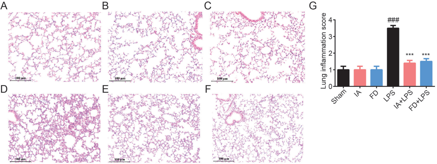 康普茶攝入降低LPS誘導(dǎo)膿毒癥小鼠炎癥因子水平、免疫細(xì)胞亞群水平??灯詹钄z入改變LPS誘導(dǎo)膿毒癥小鼠細(xì)胞因子的mRNA水平,肺組織病理學(xué)特征,康普茶攝入顯著降低了LPS誘導(dǎo)膿毒癥小鼠的肺部組織損傷程度。康普茶的攝入可以抑制LPS誘導(dǎo)膿毒癥小鼠的NF-κB激活。