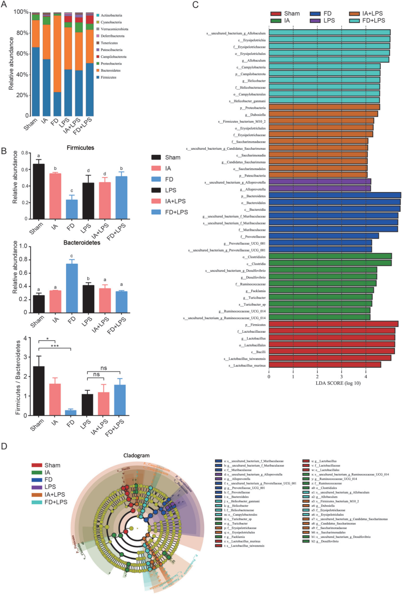 康普茶攝入對小鼠腸道微生物門水平分布產(chǎn)生了影響,不同組小鼠的腸道微生物群不同:在Sham組,乳酸桿菌屬為生物標(biāo)志物;在IA組中,彎曲桿菌屬、法克蘭菌屬、瘤胃球菌科和脫硫弧菌屬是生物標(biāo)志物;在FD組中,普雷沃氏菌科屬和未培養(yǎng)的細(xì)菌屬為生物標(biāo)志物。異種桿菌屬是LPS組的生物標(biāo)志物,F(xiàn)D+LPS組是幽門螺桿菌、白桿菌和真桿菌,杜博西菌和念糖菌是IA+LPS組的生物標(biāo)志物。