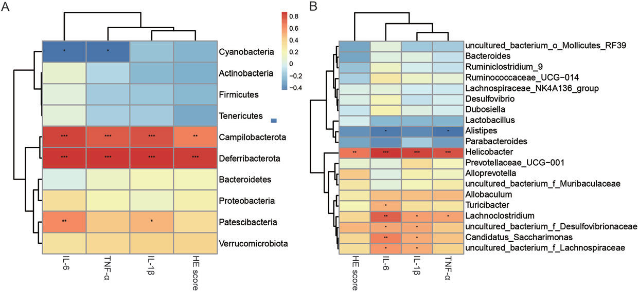 計算6組間差異,評價IL-1β、IL-6、TNF-α和HE評分對微生物群組合的影響。去鐵桿菌門與IL-6、IL-1β、TNF-α和HE評分呈正相關(guān),相關(guān)系數(shù)分別為0.852(p<0.001)、0<0.852(p<0.001)、0.843(p<0.001)和0.852(p<0.001)。藍(lán)細(xì)菌門的豐度與IL-6(r=0.523,p<0.05)和TNF-α(r=0.520,p<0.05)呈負(fù)相關(guān)。在屬水平上,幽門螺桿菌與IL-6、IL-1β、TNF-α和HE評分呈正相關(guān),相關(guān)系數(shù)分別為0.816(p<0.001)、0.776(p<0.001)、0.749(p<0.001)和0.635(p<0.01)。12B)。蛛網(wǎng)膜梭狀芽孢桿菌與IL-1β、IL-6和TNF-α也呈正相關(guān),相關(guān)系數(shù)分別為0.700(p<0.01)、0.515(p<0.05)和0.509(p<0.05)。而腐爛別樣桿菌與IL-6和TNF-α呈負(fù)相關(guān),相關(guān)系數(shù)分別為0.482(p<0.05)和0.517(p<0.05)。