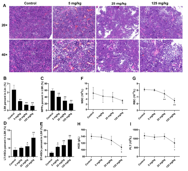 骨髓是苯暴露的主要靶器官,含有大量的造血干細(xì)胞。所有成熟的血細(xì)胞通常來源于造血干細(xì)胞( HSCs)。暴露于苯的小鼠股骨切片的H&E染色顯示出造血損傷的跡象。苯暴露小鼠骨髓中有核細(xì)胞密度明顯降低,主要表現(xiàn)為髓系造血細(xì)胞(WBC、RBC、巨核細(xì)胞和粒細(xì)胞)減少,細(xì)胞間隙增大,脂肪滴積聚,細(xì)胞腫脹。這些病理改變在125mg /kg苯組小鼠中更明顯,而在對照組中則不明顯(圖2A)。為進(jìn)一步研究苯暴露對造血細(xì)胞生長和自我更新的影響,采用流式細(xì)胞術(shù)定量檢測造血干細(xì)胞LSK、多能祖細(xì)胞(MPPs)、長期造血干細(xì)胞(LT-HSCs)和短期造血干細(xì)胞(ST- HSCs)。這一結(jié)果表明,與對照組小鼠相比,接觸苯后LSK和MPPs降低,而 LT-HSCs和ST- HSCs增加(圖2B-E)。苯中毒是惡性腫瘤發(fā)生前的一種表現(xiàn),其特征是全血細(xì)胞計數(shù)顯著減少。該研究中,125 mg /kg苯組WBC、RBC、HGB和PLT水平顯著降低(P<0.05)(圖2F-I)。綜上所述,LSK比5 mg/kg和25 mg/kg苯暴露組的血液學(xué)變化更敏感,表明LSK可能是對造血損傷反應(yīng)的敏感指標(biāo)。125 mg/kg苯暴露后,血液系統(tǒng)發(fā)生明顯變化,并形成苯毒性模型。