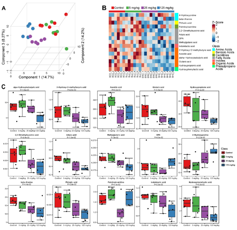使用絕對定量代謝組學(xué)研究了苯暴露30天后血漿代謝物的差異變化。如圖4A所示,成功建立了PLS-DA模型,相似樣本聚集顯著。同時,分別用PLS-DA和Mann-Whitney U檢驗計算VIP值和P值。采用UPLC-MS/MS共鑒定了209種血漿代謝物,15種不同代謝物。在VIP>1和P<0.05閾值下,苯暴露小鼠與對照組之間的潛在生物標(biāo)記物為羥基苯基乳酸),這些代謝物主要來自有機(jī)酸、脂肪酸、氨基酸、苯甲酸、肉堿、吲哚和苯丙酸(圖4B和表S2)。15種不同代謝物的劑量效應(yīng)關(guān)系如圖4C所示。