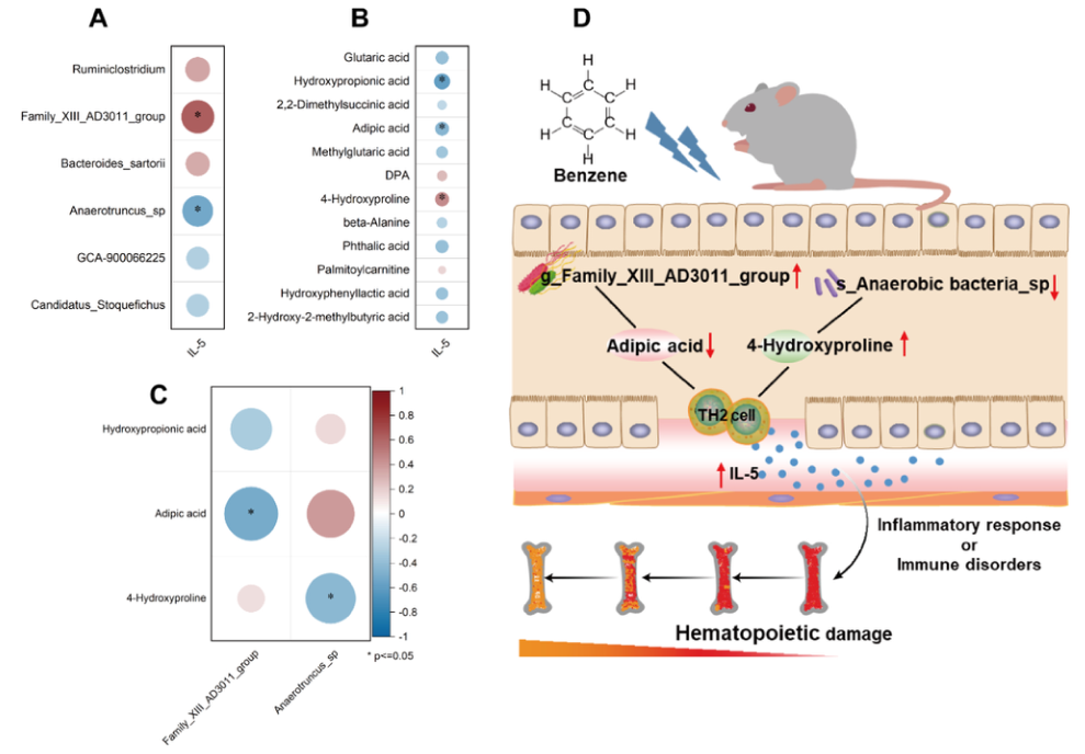 苯暴露30天后,小鼠的造血功能受損,在5 mg/kg (1.43 ppm)苯暴露水平下,造血干細(xì)胞優(yōu)先改變于外周血細(xì)胞。在低苯暴露水平下,造血干細(xì)胞的改變可能是一個更敏感的指標(biāo)。此外,作者系統(tǒng)地分析了苯誘導(dǎo)造血毒性過程中腸道菌群、代謝和細(xì)胞因子網(wǎng)絡(luò)之間的關(guān)系,并提出了一些有意義的指標(biāo),包括2種腸道微生物(Family_XIII_AD3011_group和Anaerotruncus_sp),2種血漿代謝物(己二酸和4-羥脯氨酸)和促炎細(xì)胞因子IL-5。研究結(jié)果為腸道菌群-代謝-炎癥在苯誘導(dǎo)的造血損傷中的作用提供了新的見解,未來需要通過功能研究進(jìn)一步探索。