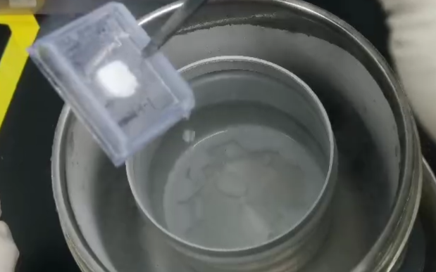 用鑷子夾緊包埋盒,使異戊烷沒過其底部但不淹沒整個包埋盒,不要使異戊烷浸入包埋盒內(nèi)(組織不直接接觸異戊烷),當(dāng)OCT由透明轉(zhuǎn)變?yōu)橥耆煌该鞯陌咨珘K狀時,組織基本完全凍結(jié),取出包埋盒并放入-80℃冰箱保存(在室溫下,異戊烷溫度會迅速升高,冷凍過程中一旦異戊烷升溫,需要馬上置于液氮中重新冷卻)或直接進行切片。冷凍時間可根據(jù)組織類型和大小而變化。