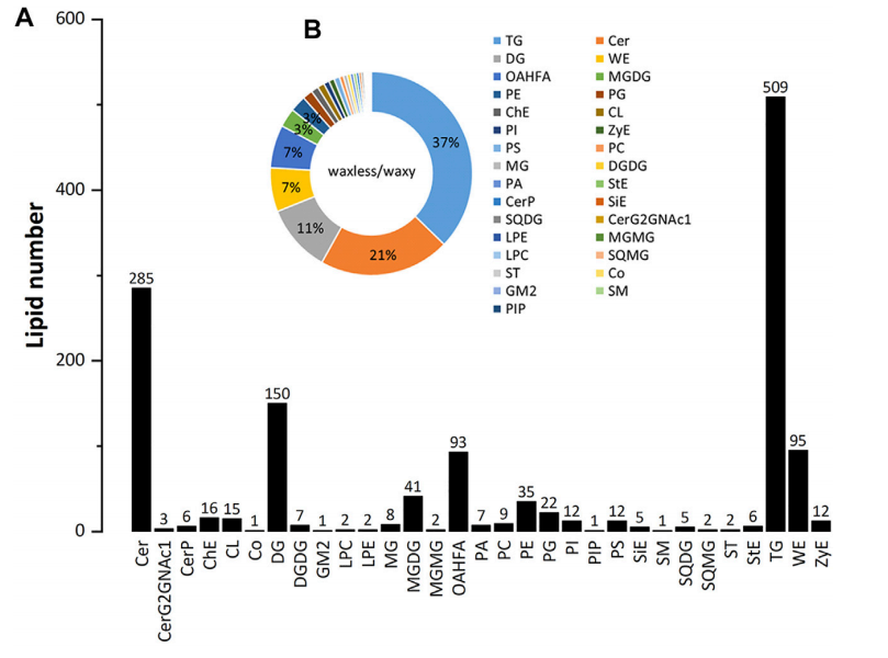 1. 本研究對冀麥22號低蠟突變體和多蠟突變體的葉表皮蠟進(jìn)行了非靶向脂質(zhì)體檢測和轉(zhuǎn)錄組分析。共鑒定出31個脂類亞類和1,367個脂類分子。